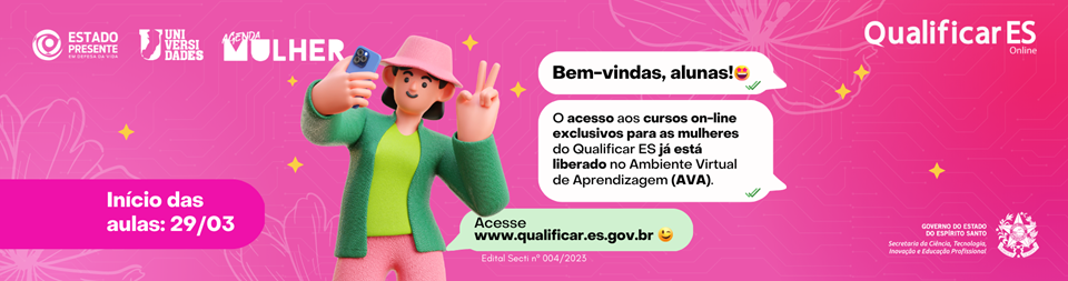 As candidatas classificadas para os cursos on-line do Programa Qualificar ES já podem acessar as aulas a partir desta quarta-feira (29). Os cursos ofertados pelo Governo do Estado, por meio da Secretaria da Ciência, Tecnologia, Inovação e Educação Profissional (Secti), em parceria com o Programa Agenda Mulher, são ministrados no Ambiente Virtual de Aprendizagem (AVA), no endereço do site www.qualificar.es.gov.br.